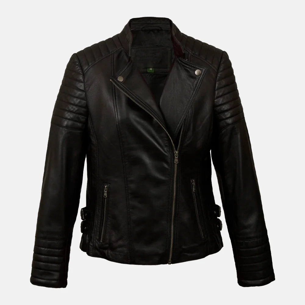 For traditional design with contemporary flare, the Bombshell Ladies Biker Jacket for Women is essential. The asymmetric zip fasten, complex stitch pattern, open-ended cuffs, adjustable side belts, and utilitarian pockets make this jacket the ideal blend of design and utility. The stand-up collar and innovative design upgrades make it a standout item that will transform any ensemble and make you feel confident and fashionable.